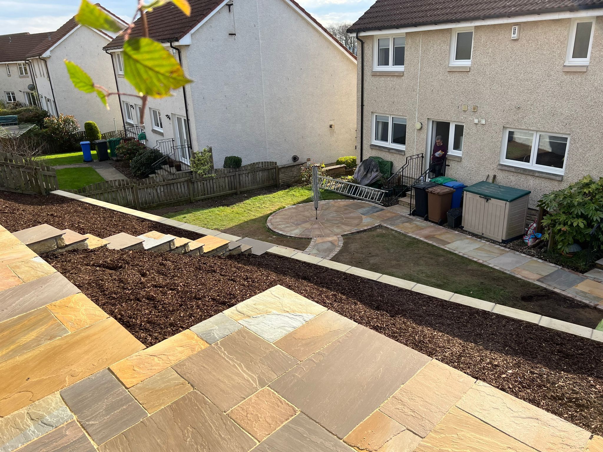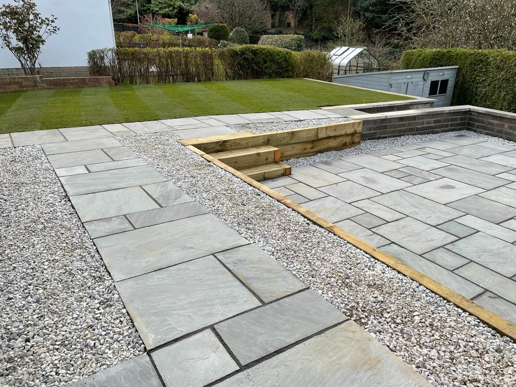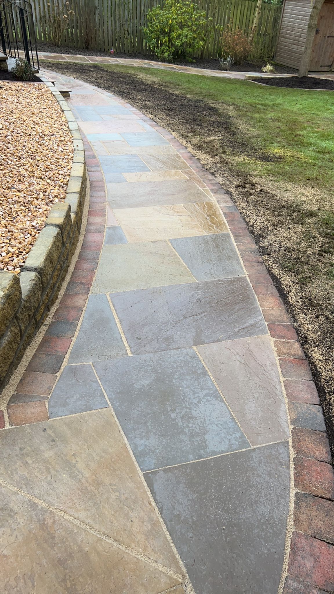 A bespoke garden transformation combining a natural stone pathway with decking to improve both access and usability of the outdoor space.